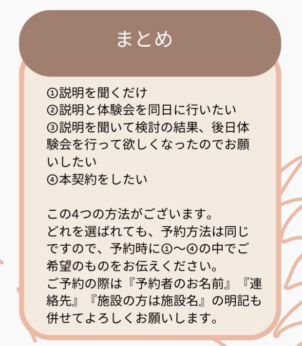 注意事項:①~④のどれを選ばれても、ご予約は希望日の1週間前までにお願いいたします。